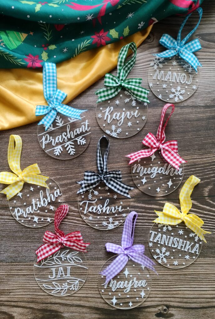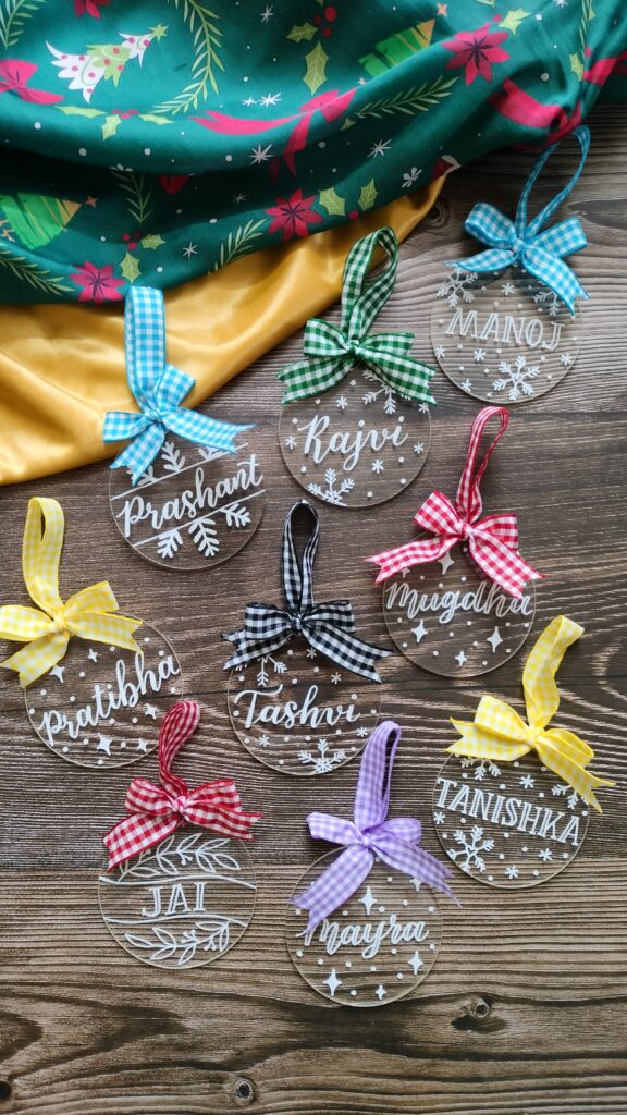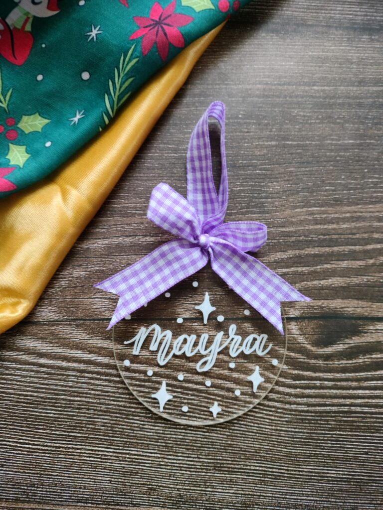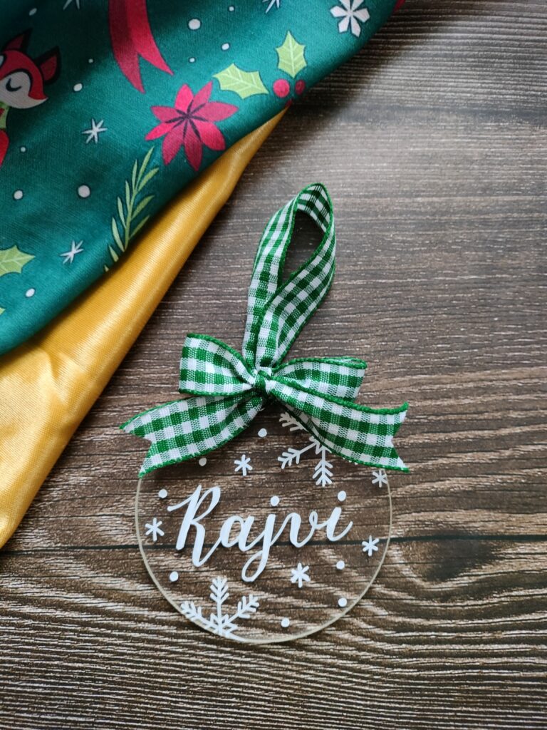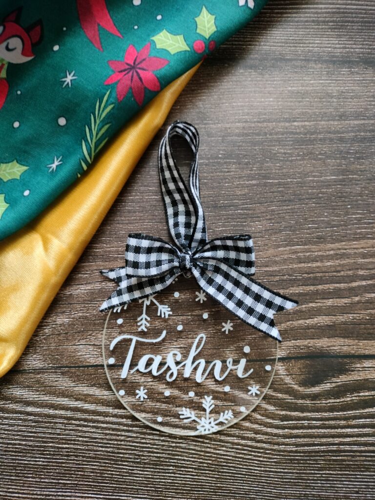 Our personalized acrylic ornaments are light-weight and durable. Measuring 3 inches in diameter and 3mm in thickness, these ornaments are hand lettered in white ink. The white design on a transparent disc has a very simple yet elegant look to it. Combined with a gingham bow loop, you can see how charming they look.