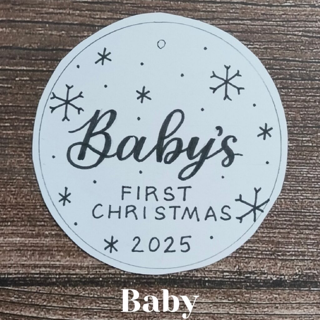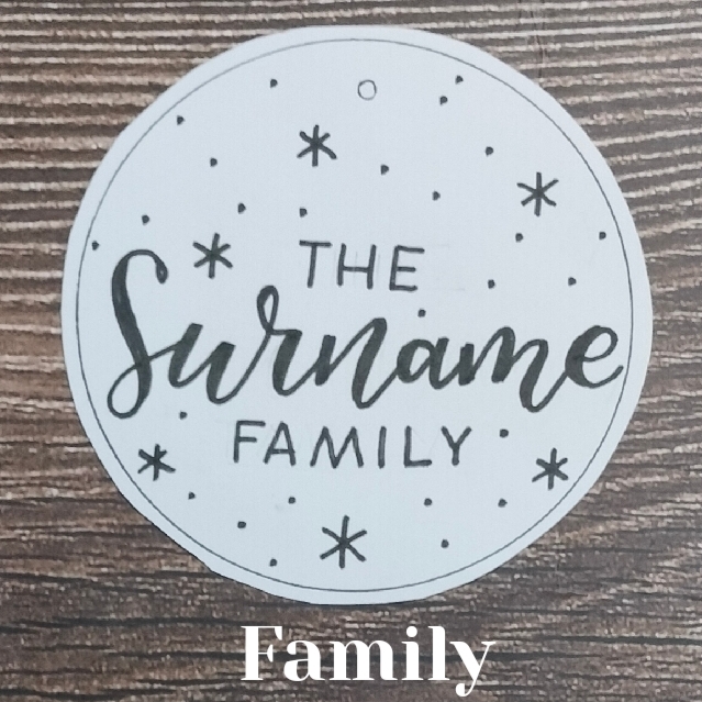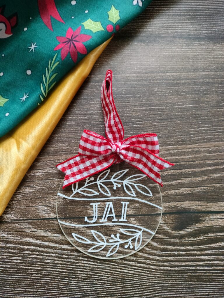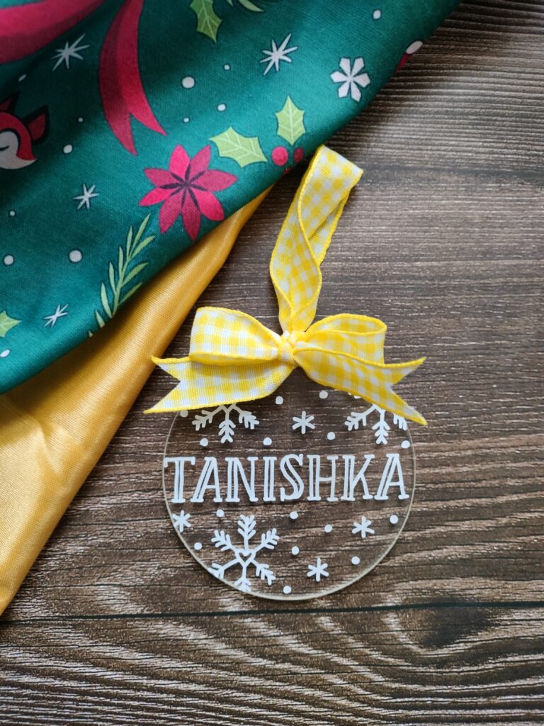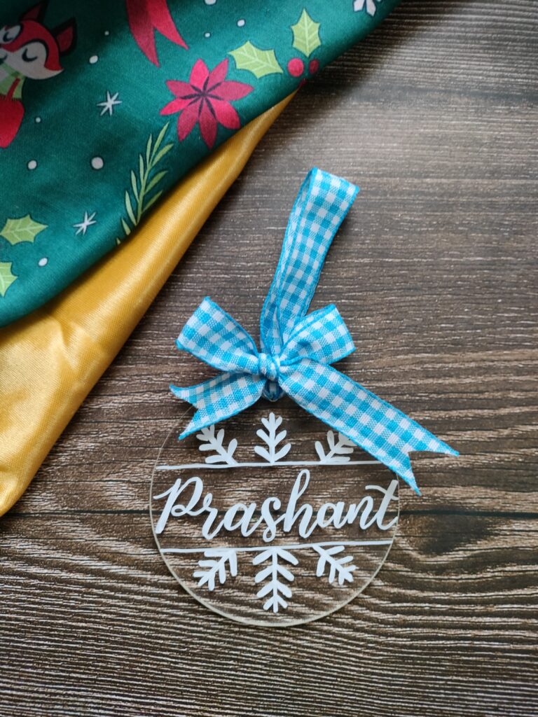 Our personalized acrylic ornaments are light-weight and durable. Measuring 3 inches in diameter and 3mm in thickness, these ornaments are hand lettered in white ink. The white design on a transparent disc has a very simple yet elegant look to it. Combined with a gingham bow loop, you can see how charming they look.